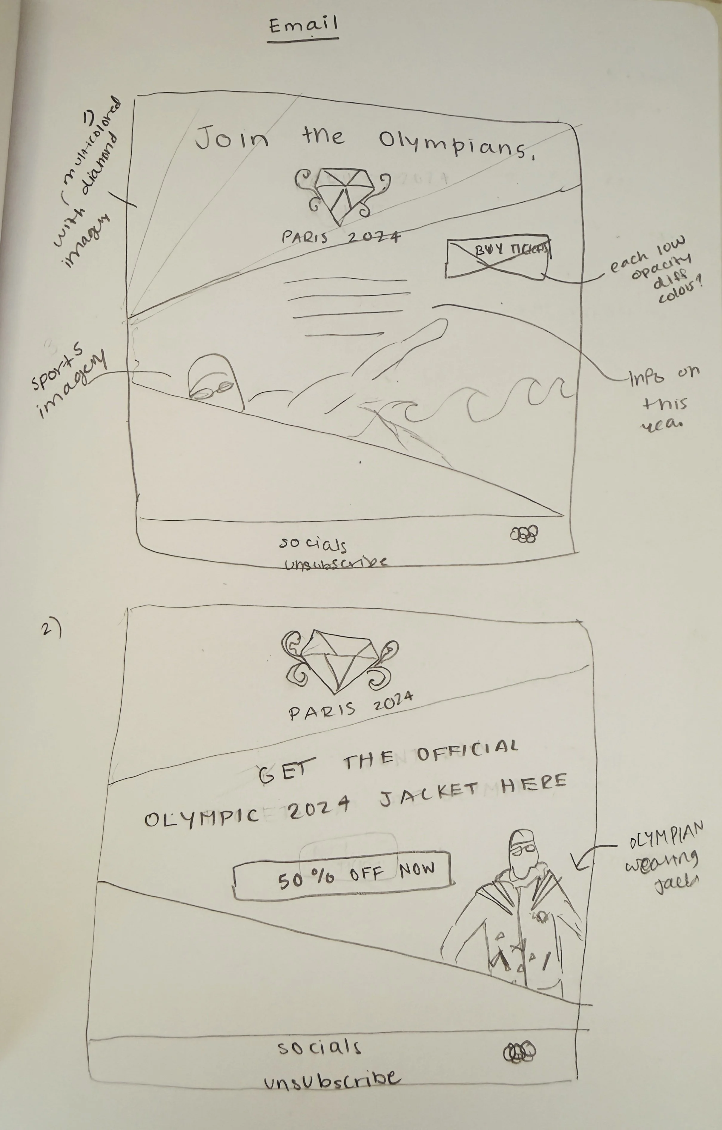 Finally, for my digital media, I made newsletter-style emails. These are mobile versions for now. The emails are also shown as mockups on an iPhone screen. The ideology behind these was to show promotion to users to grab their attention. This is why I had catchphrases such as big deals on merch, or the invitation phrase, “Join the Olympians.”, my intent was for the email to feel personal to the user. As can be seen, I’ve incorporated my merch from before into the emails in related situations, as well as informaiton on the official Paris stadium, a count-down till the Olympics (stated in french too), and email bottom headers with social media, etc. I made my designs to still connect to the colors of my brand and maintain that triangular form.